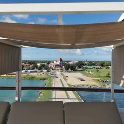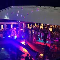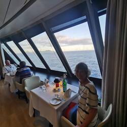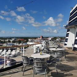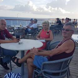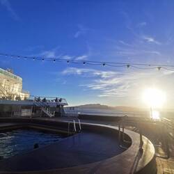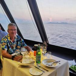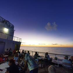 Wieder ein sonniger Seetag und das uebliche Ritual. Erst zum stretchen zu Daniela und dann relaxen auf der sonnenmuschel. Abends ein schoener platz im Meditterran