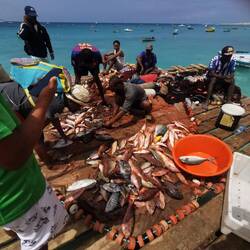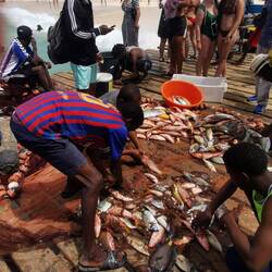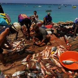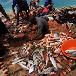 An der Pier kamen die Fischer an und sortierten den fang. Sehr farbenfroh.