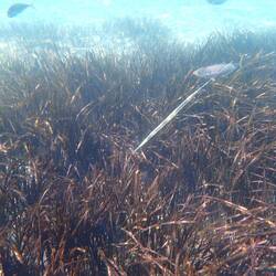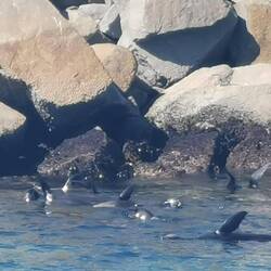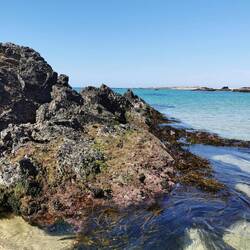 Ein schnorchelstrand mit Hainetzen. Gegenüber tummeln sich die Robben.