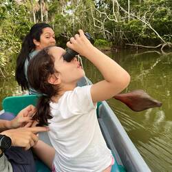 Day 2 (Kyla’s birthday): After our early breakfast, we walked to an observation tower not far from our lodge. The number of birds we saw was astounding--toucans, macaws and 947297474 other species. We spent a few hours high up in the trees looking at birds through a telescope. If someone had told me at 20 that I would care even a tiny bit about species of birds, I would not have believed them, but middle age combined with the Amazon and - BAM - I care about birds. Talia loved spotting birds too, so aparently middle age is not a critical ingredient. With the exception of Kyla dropping her binoculars into the tree canopy (and then having them rescued by Dario + a long stick), it was a peaceful, sweet morning in the trees.