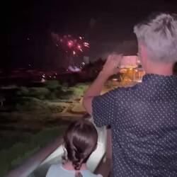 Figuring we’d need to keep Talia up to at least catch the beginning of the festivities, we went out to dinner at 7. I thought we’d be able to hit a few bonfires on the beach on our walk home, put Talia to bed, and then relax and head to bed at 12:01, as per our usual routine