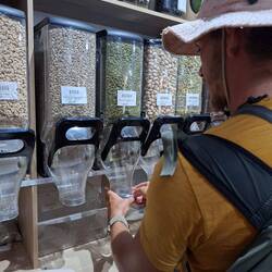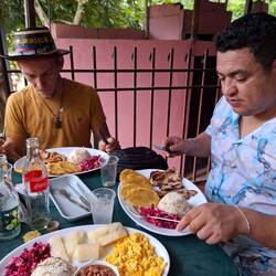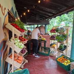 La redescente se passe bien, un peu plus lentement pour Isabelle, qui a glissé sur une pierre et s’est fait mal à la cuisse, heureusement sans trop dd gravité. Après cinq heures de marche, nous arrivons en bas, où notre chauffeur nous attend. Il nous dépose au restaurant La Nativa, un végétarien qui propose une cuisine ancestrale. On se régale : un almuerzo avec soupe, jus et plat. Repu·e·s, nous reprenons la route de l’hôtel, avec un arrêt à la boutique La Linterna pour montrer les belles affiches découvertes à Cali. Puis nous allons nous reposer. Malo part faire son dernier cours d’escalade.