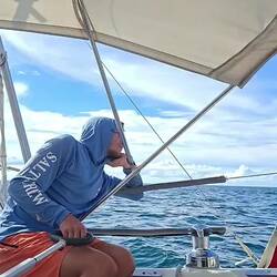 De retour à bord, nous allons rapidement nous coucher : demain, jour de navigation. On croise les doigts. Le lendemain, le moteur démarre, avec quelques toussotements, mais il démarre. Nous partons avant Blue Moana et mettons le cap directement sur l’île la plus éloignée des Hollandeses Cays pour accéder au wifi. Nous avons environ trois heures de navigation. Malo veut pêcher : il sort deux cannes à l’arrière du bateau. Malheureusement, il n’y a pas de vent, donc nous avançons au moteur.