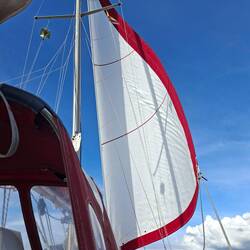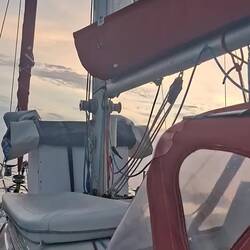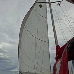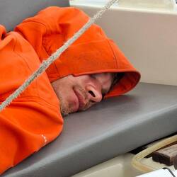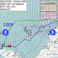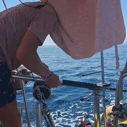 Quand je retrouve Malo au petit matin, après être sortie de ma sieste, il est frustré : on n’avance pas 🤯 La zone où nous sommes n’est pas censée être soumise à un fort courant, mais pourtant le bateau peine à dépasser les 3 nœuds... C’est vrai que c’est un peu frustrant. Je propose d’ajouter la grand-voile en ciseaux pour davantage de portance. Malo hésite, mais on tente quand même. On fait la manœuvre, sans grand succès : la houle nous secoue trop et le génois se dévente. On refait la manœuvre face au vent pour affaler la grand-voile, et on reste uniquement avec le génois.