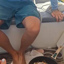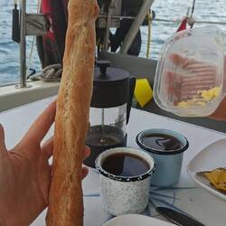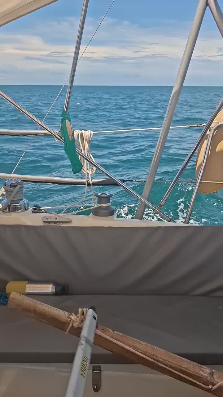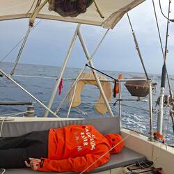 Je me motive à faire cuire des pâtes pour notre repas, c’est sport ! Heureusement que la gazinière est sur vérin pour éviter que l’eau ne se renverse. Une fois repus et un peu reposés, nous allons à l’avant du bateau profiter d’une houle plus calme. Ça fait du bien ! On se dit que nos voisins doivent sûrement être déjà arrivés… Parfois, on rêve d’un bateau plus raide, mais on profite quand même 😅