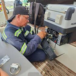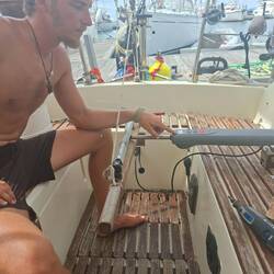 Ça y est, le bateau est prêt. Malo lance le moteur… et rien ne se passe. On se regarde, inquiets. Ça commence à devenir pesant, cette histoire : nous ne savons plus quoi faire. Nous avons fait la vidange, changé les silent-blocs, révisé les tubulures et les injecteurs… Olivier vient à bord pour nous aider ; il a un manuel des pannes moteur. On y va pas à pas. On vérifie la cuve : y a-t-il des saletés qui boucheraient l’arrivée d’essence ? Malo avait vérifié avant de partir, mais sait-on jamais. On démonte, on remonte les tubes d’arrivée, on ouvre la cuve, on regarde le préfiltre. Il y a quelques saletés, mais rien de dramatique.