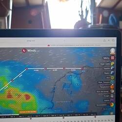 On observe un gros nuage gris, et ça ne manque pas : tout à coup, un énorme grain s’abat sur nous ! On enroule un peu de génois car les rafales doivent bien atteindre les 30 nœuds. On range le pilote automatique et on barre à la main. Au bout d’une heure, ça se calme. On essaye de sécher comme on peut, puis on réinstalle le pilote automatique (le nouveau, ramené par Isabelle et Stéphane lors de leur venue — merci !!). Ça nous soulage bien.