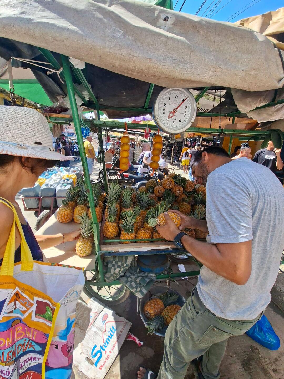 Après notre session de découverte en annexe, nous nous préparons à lever l’ancre : aujourd’hui, nous prévoyons de partir vers les Hollandeses Cays. Le bateau est presque prêt quand une barque remplie de fruits et légumes nous accoste. Ici, le marché vient directement au bateau : les marchands arrivent avec leur embarcation pleine de provisions et nous faisons nos achats. Pratique !
