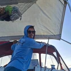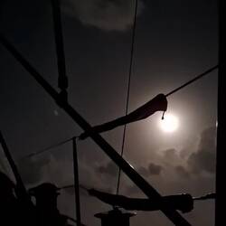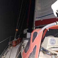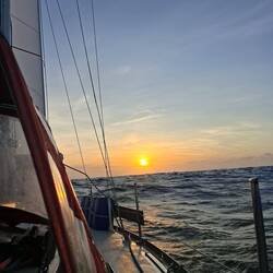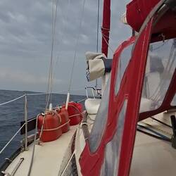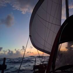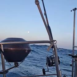 La deuxième nuit débute, la lune est toujours aussi grosse : c’est beau, il fait presque jour ! Nous n’avons croisé qu’un seul cargo, bien loin de nous — sinon, nous sommes seuls sur cette immensité d’eau. Nous arrivons dans une zone avec du courant, on sent que l’on ralentit, tout comme le vent. On se décide à mettre un peu de moteur pendant deux heures pour ne pas trop perdre de temps. On enchaîne nos quarts ; je me sens un peu fatiguée, en partie à cause de la houle qui nous secoue. Difficile de faire quoi que ce soit à bord !
