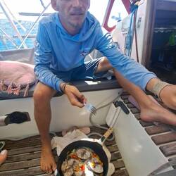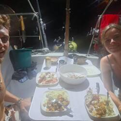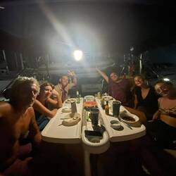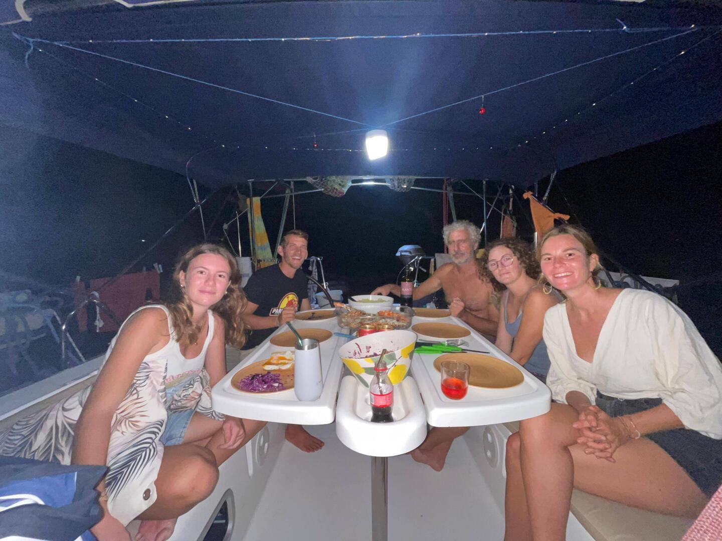 Après trois heures dans l’eau, nous remontons sur les annexes, fatigués mais contents de notre belle pêche. Nous pensions plonger cet après-midi, mais finalement nous décidons de rester tranquilles : la sortie nous a bien tiré les bras ! Après un repos bien mérité, nous nous retrouvons tous à bord de Noam pour partager un bon dîner de poisson : légumes au four, poisson grillé au barbecue et riz à la tomate. On se régale ! La soirée se termine par un jeu : « une phrase, un dessin ».