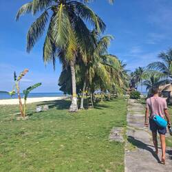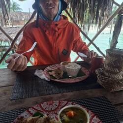 Nous arrivons vers l’île de Banedup (les noms ici ne sont pas simples à retenir !). Le mouillage est assez rempli, mais nous trouvons une petite place. Nous allons rapidement à terre vers le restaurant-wifi. Nous trouvons de la connexion et savourons un bon poisson avec des légumes au lait de coco : un régal. L’endroit est très sympa : des bancs et tables en bois posés directement sur l’eau, parfait pour notre AG de demain. Je prépare rapidement le diaporama de présentation pour la réunion, on se met à jour sur nos connexions, puis nous repartons.