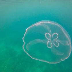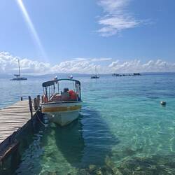 Contents de notre virée, nous rentrons au mouillage. Après le déjeuner, je suis installé sur le pont quand, tout à coup, en regardant la mer, j’observe un aileron… Je crie à Malo : « Un dauphin ! ». On s’équipe, on saute à l’eau et on essaye d’aller l’observer : il est grand. C’est magique. Pas facile à suivre, mais chouette ! On le dit aux voisins, qui se joignent à nous. On barbote et on tombe sur des requins, raies rondes, pastenagues, aigles… Il y a de quoi voir !