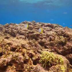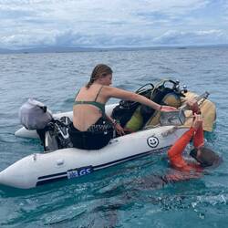 Aujourd’hui, dimanche, nous avons prévu une session pêche avec les Moana. Nous nous équipons : harpons, foëne (un trident pour chasser les poissons-lions), ceinture de plomb… et c’est parti. Nous passons prévenir les voisins que nous sommes prêts, puis nous filons. Avec nos deux annexes, nous allons sur un joli spot. Ils sont novices dans ce domaine, donc on leur enseigne quelques bases, surtout pour la chasse au poisson-lion. Joanne est très motivée ; comme souvent, elle dégage une superbe énergie de sportive et d’aventurière. On lui explique le principe de la foëne et, très vite, elle parvient à tirer deux poissons-lions. Avec Malo, nous en tirons également ; nous terminerons cette chasse avec cinq beaux poissons-lions.