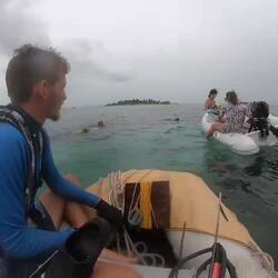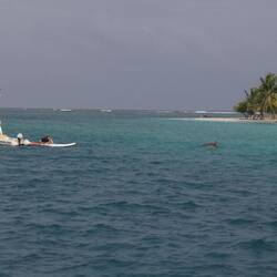 Quand nous partons, les Blue Moana arrivent : nous allons les accueillir en kayak. À tout à l’heure les copains, nous partons en exploration. Nous faisons plus de deux milles en kayak, allant d’îles en îles : ce sont vraiment de petits îlots. Sur l’un, il y a un restaurant ; sur un autre, des ruines de toilettes ; sur un autre encore, des déchets plastiques à ne plus savoir qu’en faire… Nous arrivons sur une île avec quelques habitations ; en arrivant, nous voyons des hommes qui s’apprêtent à partir pêcher. L’île est toute petite, nous n’osons pas débarquer sans demander. Nous demandons donc si nous pouvons faire le tour : oui, pas de problème. Nous tirons notre kayak un peu plus haut sur la plage et nous nous rendons compte que nous sommes observés !