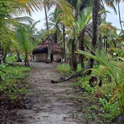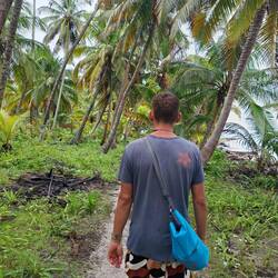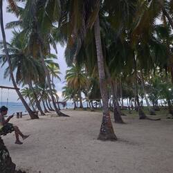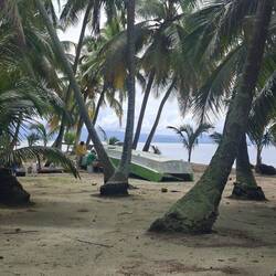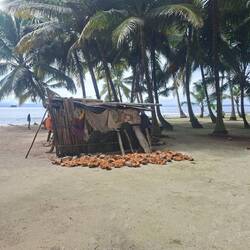 Cette petite île, comme les San Blas en général, s’est ouverte au tourisme il y a environ cinq ans. Elle n’a pas de village à proprement parler : les habitants qui y vivent viennent par rotation de six mois pour s’occuper des cocotiers. Ici, chaque cocotier appartient à une famille ; interdiction donc de toucher aux noix de coco ! On comprend pourquoi : c’est quasiment le seul arbre que nous avons vu depuis notre arrivée.