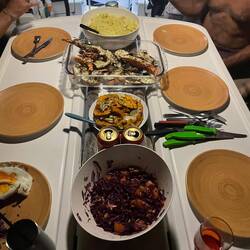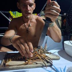 Nous sommes également retournés surfer : Malo, Joanne et Olivier sont au paradis ! Mercredi, des pêcheurs sont venus nous voir et nous ont proposé des langoustes. Malo a craqué et nous a préparé un superbe repas le soir, un délice. Le lendemain, Wanda nous hèle en début d’après-midi : « Hey, ça vous dit des langoustes ? ». Allez, c’est reparti : le soir, nous allons donc dîner chez eux pour savourer encore une fois ces beaux crustacés. Malo fait un tuto pour tuer et préparer la langouste aux voisins. On passe une belle soirée 🩵