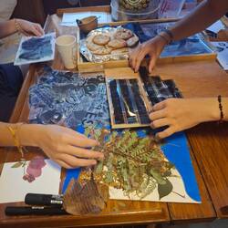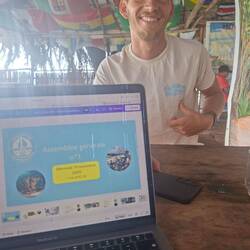En début de semaine, c’était atelier cyanotype avec les Blue Moana, à bord de Noam. Nous avons, sous une chaleur écrasante, réussi à faire de jolies œuvres grâce au soleil. Nous avons mis quelques jours à trouver le bon créneau, car le soleil est souvent couvert ici et les orages assez nombreux. La pluie est souvent présente, mais ça n’entache pas notre motivation pour les activités.