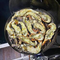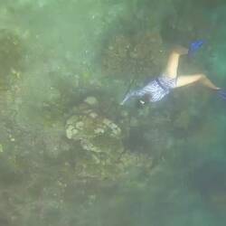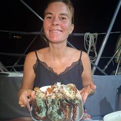 En arrivant, Blue Moana nous appelle en criant qu’ils ont pêché trois poissons ! Malo peste : nous, aucun… ce sera pour la prochaine fois. Ils se sont mis un peu plus loin au mouillage. En fin de journée, nous les retrouvons pour une session snorkeling. Nous attrapons deux poissons-lions et deux petites langoustes pour le dîner. Décidément, on se régale. Je rentre au bateau à la nage : ça fait du bien.