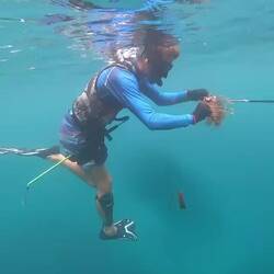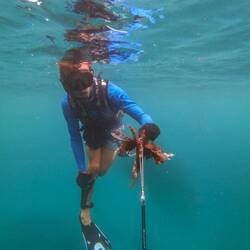 Personnellement, je ne chasse que cette espèce, car elle est invasive dans les Caraïbes, échappée d’aquariums de Floride. Donc, en plus de nous nourrir, nous contribuons à la conservation des écosystèmes : plutôt pas mal. Les fonds sont magnifiques, l’eau est claire, les récifs affleurent, on croise des petites méduses, des langoustes, des poissons en tout genre… Les langoustes que nous repérons sont trop petites pour être prélevées. Il n’y a pas de saison de pêche ici et, avec le développement touristique, on a l’impression que poissons et crustacés n’ont pas toujours le temps de se régénérer. 🐟