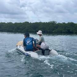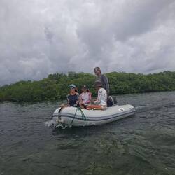 Ce matin, nous partons en exploration en dinghy (= annexe). Certains îlots autour de nous sont couverts de mangrove : nous avons bien envie d’y jeter un coup d’œil. Avec nos deux annexes, nous sillonnons les différents îlots. Nous nous arrêtons dans un petit amas d’îlots où plusieurs catamarans mouillent ; pour y accéder, il y a une passe à 2 m de profondeur. Avec les monocoques, c’est un peu juste. Nous, avec Noam, avons 1,75 m de tirant d’eau, mais nous préférons ne pas prendre de risque.