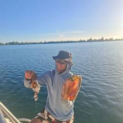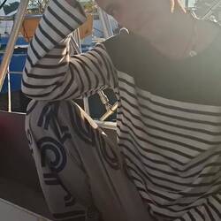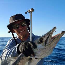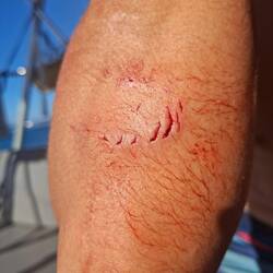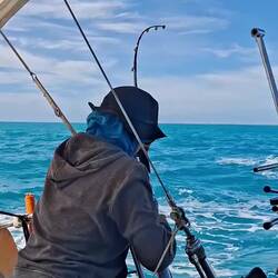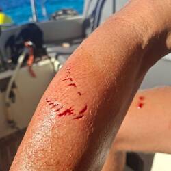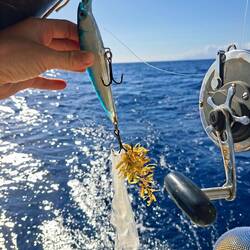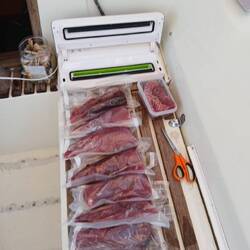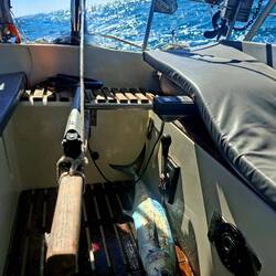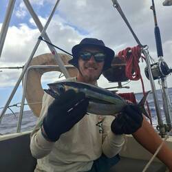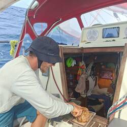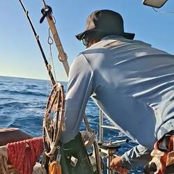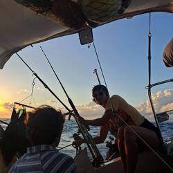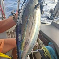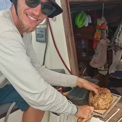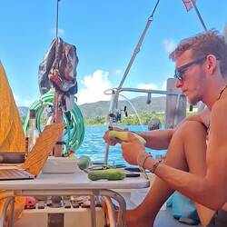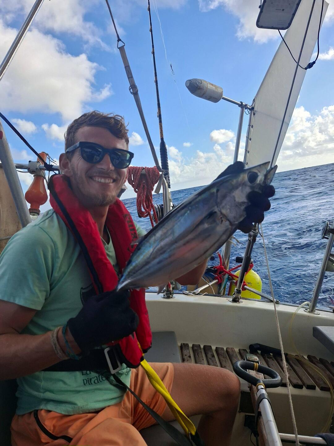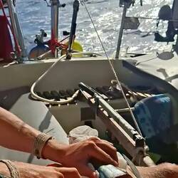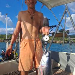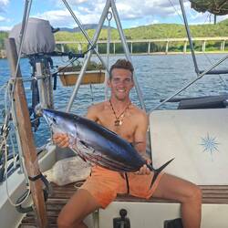 Malo remet la canne à l'eau, après quelques heures il remonte un joli thon. Il a de superbes traits bleu, un thon zélé. Malo le vide, on le mets dans un sac au frigo, on le partagera demain avec nos amis à l'arrivée à Cuba 🐟