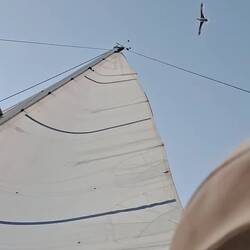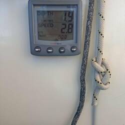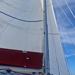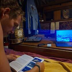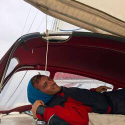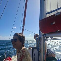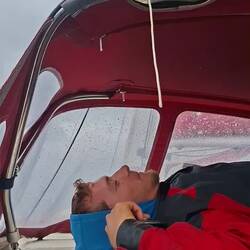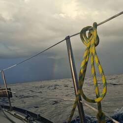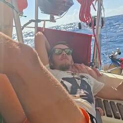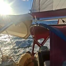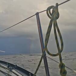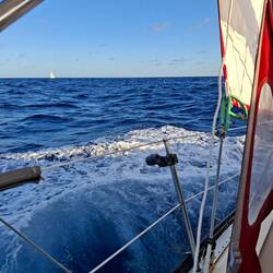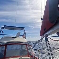 Nous sommes proches du vent, le bateau bien incliné nous devons être vigilant à garder de la vitesse, sans trop s'éloigner du vent. La houle frappe sur le bateau mais nos corps sont bien habitués après 5 jours en mer. L'état un peu nauséeux des premiers jours est bien passé. Nous restons quand même essentiellement allongés sur les banquettes, faute de pouvoir tenir à la verticale. Je fais la lecture à voix haute d'un roman d'un médecin légiste qui raconte ses cas, ça nous occupe bien !
