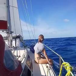 Pour notre troisième jour de navigation, le vent se cale un peu plus au travers ; le bateau gîte un peu moins, c’est agréable. On se rince tant bien que mal, c’est toujours un peu folklorique ! Demain, on tente la vraie douche !