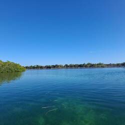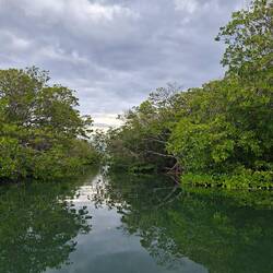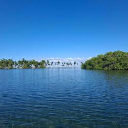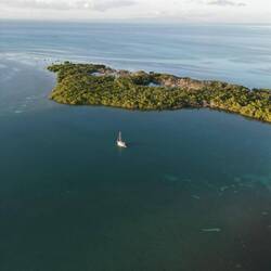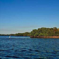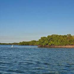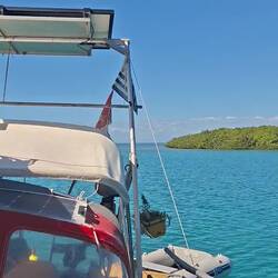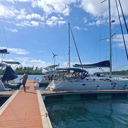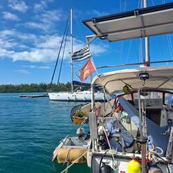 Nous empruntons le chenal au moteur jusqua l'entrée de la marina. Le décors est sublime, l'eau est turquoise, la mangrove borde la rive, une belle plage sur la gauche... On découvre une petite marina avec quelques bateaux et nos amis au fond sur le troisième ponton.