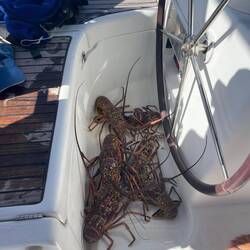 Le vent est encore présent et il y a un peu de mer mais nous y arrivons. Nous arnachons l'annexe à une bouée et c'est parti. Le lasso pour attraper les langoustes entre les mains et c'est parti. C'est une piscine ! C'est vraiment très beau. Nous ne repartons pas bredouille, nous attrapons 7 belles langoustes : énormes !! On va se regaler.
