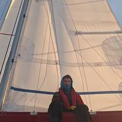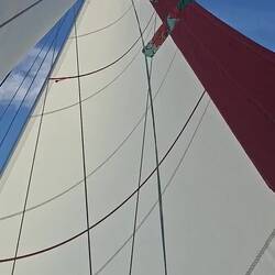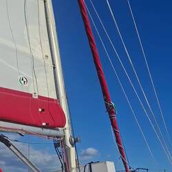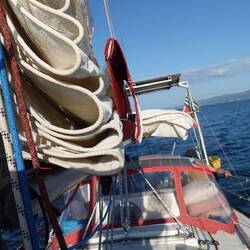 Les navigations au près sont assez éprouvantes pour le materiel et l'équipage ! Malo se met à la proue du bateau pour accompagner la montée du foc. Je suis au winch pour mouliner et hisser la voile sur l'étai de textile situé à l'arrière du génois que nous enroulons.