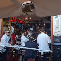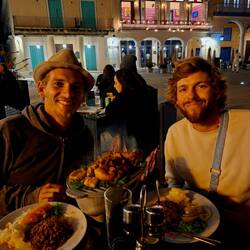 On dîne à terre, en bavardant dans des rues bien animées, avec de la musique toujours plus forte !