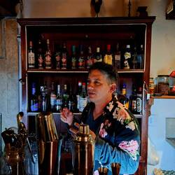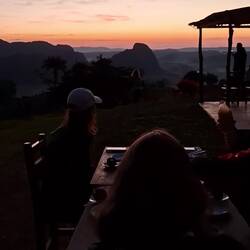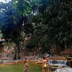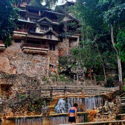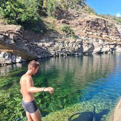 Les lieux sont magnifiques : les bassins ont été façonnés sur le lit de la rivière. Tout est pavé et joliment construit. Après un buffet bien copieux, nous allons nous baigner. L’eau est fraîche ! C’est la rivière, ça nous saisit. On se prélasse sur les transats, puis nous allons jouer aux cartes dans le bar qui domine les lieux. Lionel, notre ami du Rebelle, est là aussi. Il nous fait rire : il vient nous voir, verre de gin à la main — « Ce n’est pas possible, ils ne font que boire ici ! On n’a pas le temps de dire ouf ! »