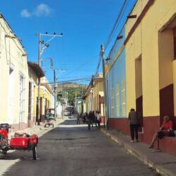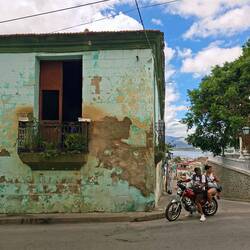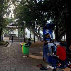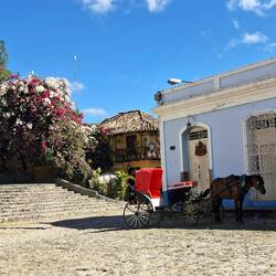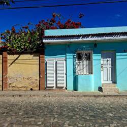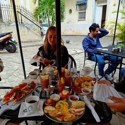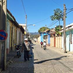 Dans le centre historique, nous déambulons seuls, sans touristes. Beaucoup de bâtiments sont en mauvais état, mais la vie est partout. Sur la place centrale, des cireurs de chaussures travaillent encore, un métier disparu chez nous. Nous cherchons un endroit pour dîner, mais étonnamment, peu de choix le soir, à part des empanadas frites. Les comedores locaux — riz, plantain, haricots noirs, viande — semblent surtout ouverts le midi. Finalement, nous trouvons une rue un peu plus touristique, avec quelques restaurants récents. Nous nous installons pour une pizza et une limonade naturelle.