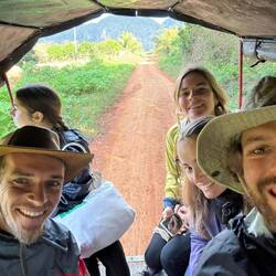 Puis nous attendons un bus au bord de la route. Finalement, un camion benne s’arrête et nous demande où nous allons. Le temps de discuter, on voit le bus passer ! Le monsieur voit nos têtes dépitées en regardant le bus filer et nous dit de monter dans la benne. On va le rattraper ! On saute à l’arrière, il conduit à toute vitesse et nous attrapons le bus (qui s’avère être un taxi !). Ça décoiffe !