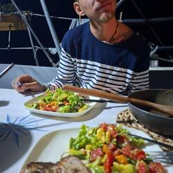 Le soir, nous nous retrouvons tous à bord de Zoan pour diner le thon pêché par Malo. On le grille au barbecue et chacun ramène légumes et autres accompagnement. La régalade !