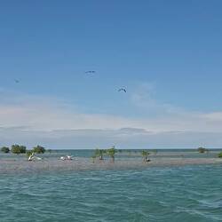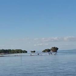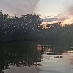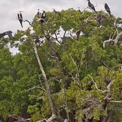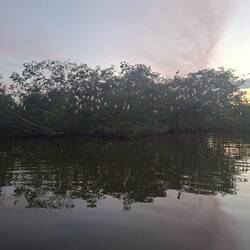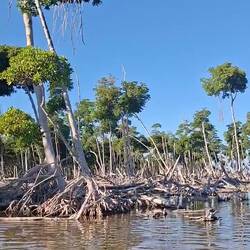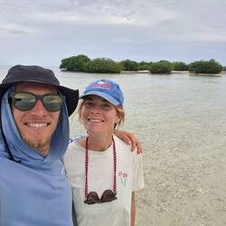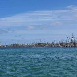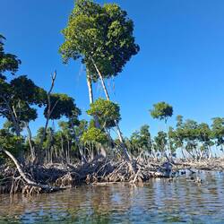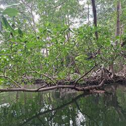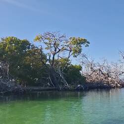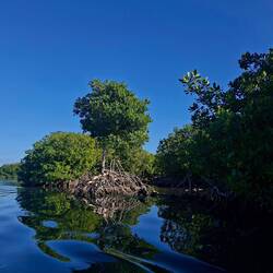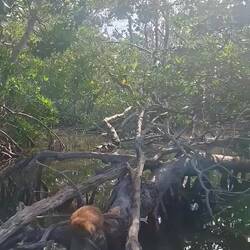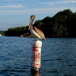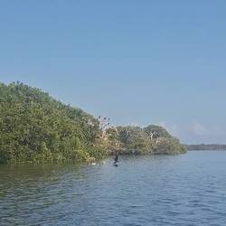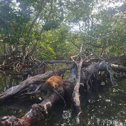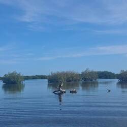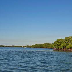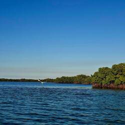 Nous commençons par enfiler masques et tubas pour observer les fonds : essentiellement des herbiers et quelques bouts d’épaves. Rien d’exceptionnel, mais la baignade fait du bien. Nous continuons ensuite notre balade dans une belle mangrove. Les palétuviers sont particulièrement grands, car peu touchés par les tempêtes. On s’amuse à observer les mouettes et les pélicans pêcher les petits poissons, affolés par les remous de l’annexe.