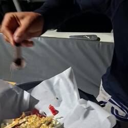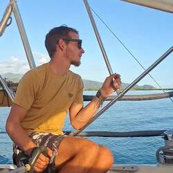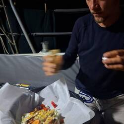 Malo se régale de poulet grillé. Nous l’avions commandé à la marina pour le manger initialement avec nos amis de *Blue Moana*. Les pluies diluviennes nous empêchant de nous rejoindre mutuellement, nous n’avons pas pu le partager avant le départ. Malo a donc un poulet et demi à manger (heureusement, ils ne sont pas énormes) 😅 Il fait le plein de viande, ça change de nos habitudes !