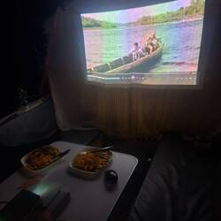En arrivant à bord, nous nous installons pour une belle soirée cinéma. Nous nous replongeons dans nos rêves d’enfant en regardant L’Île aux trésors, en mangeant popcorn et gâteaux !