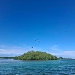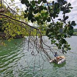 Le lendemain, nous nous réveillons dans une baie d’un calme fou. C’est super agréable : il fait très bon et le bateau ne bouge pas. Les oiseaux chantent et le clapotis des annexes qui passent près de nous crée une douce houle. Nous passons la matinée à travailler sur nos ordinateurs avant de sauter dans l’annexe pour aller explorer les mangroves et les fonds marins. En chemin, nous croisons Michael et Natacha qui reviennent d’une balade dans la réserve en face ; ils nous conseillent un sentier.