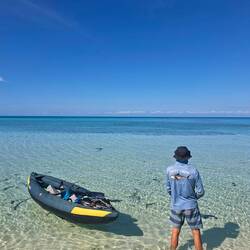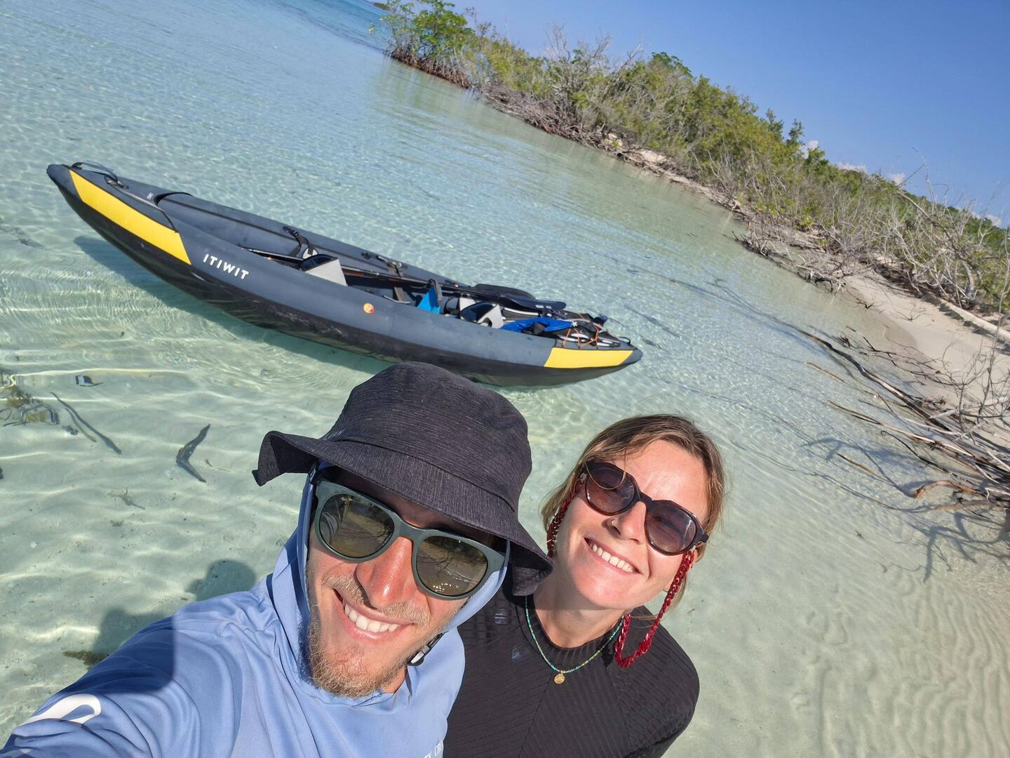 Le lendemain, on s’équipe pour aller plonger. On arrime le kayak à l’annexe, on y monte les blocs et c’est parti.