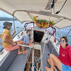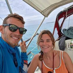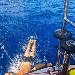 Nous avons profité d’un petit vent pour aller tirer quelques bords au large et montrer à Thibault comment Noam navigue. Les garçons ont aussi plongé. D’autres plaisanciers et plongeurs ont créé il y a quelques années un site de plongée, avec des canons et un trésor coulés. Un vrai site de pirates ! Malgré une mer un peu agitée, c’était chouette de se mettre à l’eau.