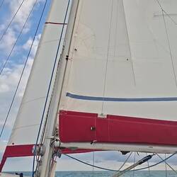 En soi, le pilote automatique tient, le bateau n’est pas complètement à plat et on avance bien, mais on sent quand même l’énergie à bord. On préfère préserver le bateau : on finit par prendre un autre ris dans la grand-voile et enrouler le génois. On est mieux réglés ainsi. On a réduit notre allure, mais on continue d’avancer. La nuit n’est pas des plus confortables pour dormir : le bateau gîte fort à bâbord. Les nuits seront meilleures au mouillage !