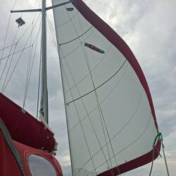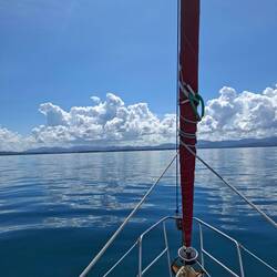 En enfournant le poisson, on observe un gros nuage qui se forme : un cumulonimbus assez dense, juste en face de nous. Nous sommes au près serré, nous n’allons pas y échapper. On se prépare, on enfile nos k-ways, on observe l’évolution du nuage, prêts à enrouler le génois. Et hop, c’est parti : la pluie arrive ! Le vent qui l’accompagne n’est pas trop violent, mais il dévente le bateau pendant un certain temps. On enroule donc la voile et on allume le moteur pour garder notre cap.