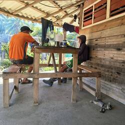 Nous embarquons nos poubelles et deux bidons de carburant pour aller respectivement les vider et les remplir. Nous beachons l’annexe sur la plage. En arrivant, nous demandons à deux hommes installés dans un hangar en bord de plage — la station-service. Tout de suite, ils nous sourient : « On vous amène, montez ! » Deux minutes après, nous voilà à l’arrière d’un pick-up pour aller chercher de l’essence. Ils sont pêcheurs. On fait les pleins en observant la vie chaleureuse de ce petit village. Les deux messieurs nous ramènent et gardent nos bidons de diesel le temps de notre promenade. Adorables !