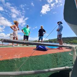 Nous sommes juste derrière un petit bateau en bois. Nous ne tardons pas à rencontrer son propriétaire, Jacques. Alors qu’il passe à la rame dans sa jolie annexe en bois, nous l’invitons à boire le café. Jacques est français. Cela fait plus de 25 ans qu’il vit sur son bateau, un joli petit bateau en bois de 70 ans ! Il en parle avec passion. Il a vécu de nombreuses années en Guadeloupe en tant que professeur de pêche dans un lycée professionnel ; avant cela, il était pêcheur à l’île d’Yeu. On discute de navigation, d’expériences en mer, de nos vies respectives. Il est passionnant.