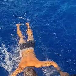 La mer est si plate que nous coupons les moteurs. Nous laissons Noam à la dérive et sautons dans le grand bleu. En mettant la tête sous l’eau, nous entendons le chant des baleines. Elles nous semblent si proches. Des grincements, des sons si caractéristiques… c’est incroyable !