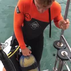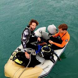 Nous nous préparons pour aller plonger ! Anne-Sophie est une plongeuse aguerrie ; Agatha, elle, est novice et appréhende un peu. Nous montons tous les quatre dans l’annexe avec les blocs de plongée. Agatha et moi grimpons dans le kayak (qui, malheureusement, est encore percé !). Nous arrivons sur un spot qui nous semble adéquat. Anne-So se met sur le détendeur de secours de Malo, et moi je suis avec Agatha. Malo et Anne-So s’immergent.