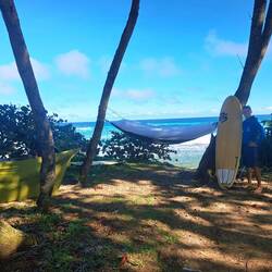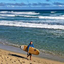 Le lendemain matin, réveil au son des vagues. Le ciel est bleu, c’est magnifique. La plage s’anime, il y a du monde à l’eau. On attrape les planches et c’est parti. Malo va dans la zone des confirmés, moi je reste sur le spot des débutants. Ici, les spots sont clairement hiérarchisés, avec des panneaux du type : « Respectez les surfeurs locaux ». Le ton est donné ! On passe une bonne heure à l’eau, dans des vagues un peu brouillonnes, mais on est contents.