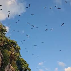 Nous avons l’impression d’entrer dans un décor de Jurassic Park. Nous sommes seuls, entourés de frégates, de rapaces, de pélicans qui tournoient au-dessus de nous. Nous jetons l’ancre après une belle navigation au portant. Cette fois, le mouillage est parfaitement abrité. Pas un roulis. Quel bonheur.
