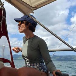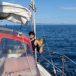 À 6 h, le réveil sonne. Les yeux encore un peu bouffis, l’équipage se réveille. Anne-So, avec son énergie et son sourire inépuisables, s’attelle à nous préparer le café. Agatha, encore dans ses rêves, vient m’aider à remonter l’ancre. C’est parti : on met le cap vers Miches, mais avant, on va divaguer un peu à l’entrée de la baie pour essayer d’apercevoir les superbes baleines à bosse qui viennent mettre bas dans les eaux protégées de Samaná.